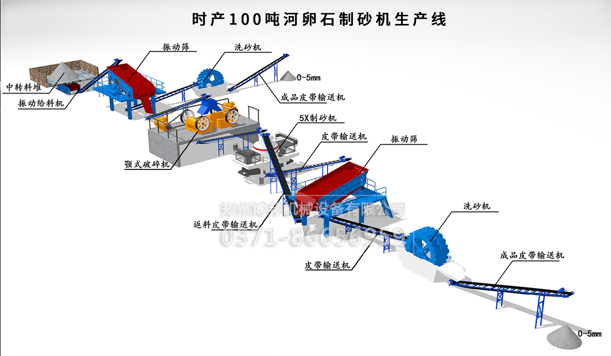 原始物料經(jīng)過料倉,由皮帶機(jī)送至重型振動篩進(jìn)行自然砂篩選,篩選的自然砂送至輪斗洗砂機(jī)進(jìn)行洗選,大塊物料由皮 帶機(jī)送至顎式破碎機(jī)進(jìn)行破碎。