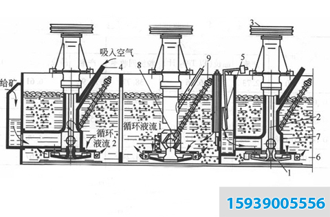 將磨碎的礦石,在磨碎時(shí)或磨碎后加水及必要的藥劑經(jīng)攪拌槽調(diào)成礦漿后,注入開始攪拌的礦漿槽,向礦漿中導(dǎo)入空氣,使其形成大量氣泡 ,一些不易被水濕潤的,即一般稱作疏水性的礦物粒子附著于氣泡上,并與氣泡一起浮到礦漿表面,形成礦化氣泡層,另一些容易被水濕潤的,即一般稱做親水性的礦物粒子不附著于氣泡上,而留在礦漿中,將含有特定礦物的礦化氣泡排出,從而達(dá)到選礦的目的。