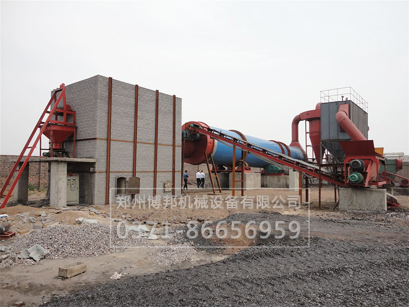 在烘干機(jī)頂部熱風(fēng)溫度達(dá)700-800℃的狀態(tài)下,物料由提升機(jī)從喂料口喂入,在重力作用下由截流器連續(xù)均勻滑落。熱氣體由下部熱風(fēng)爐生成,從下向上運(yùn)動(dòng),與物料相接觸,通過(guò)熱導(dǎo)、對(duì)流、輻射等多種方式將熱量傳遞給物料,從而使物料溫度不斷升高,水份不斷被蒸發(fā)。**終符合水份要求的物料從內(nèi)外筒之間的烘干區(qū)下部出料口卸料。